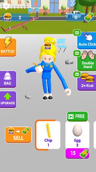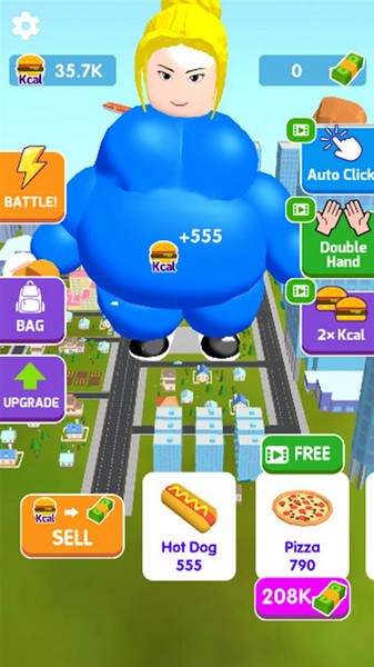 2、进入游戏后,玩家将需要将自己打造一个绝对的吃货,点击屏幕可以让角色进行吃下方的食物,每个食物下方的数字代表吃完获得的金钱;