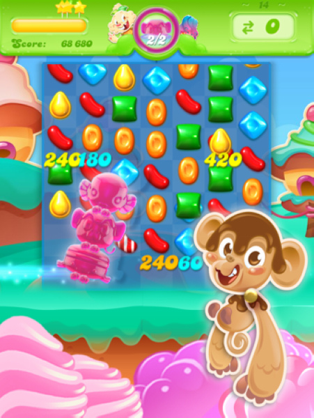 因为含有果冻的关卡,消除所有的果冻一定是通关的必要条件。所以当消除的时候,要时刻关注果冻的剩余数量和位置。当含果冻的糖果直接消除完时,要优先消除其周围的糖果,这样才能制造出果冻糖果的消除机会。