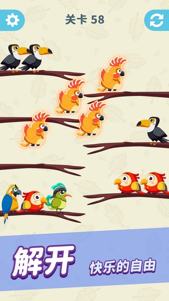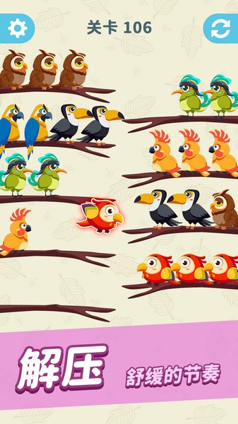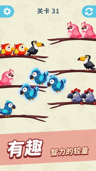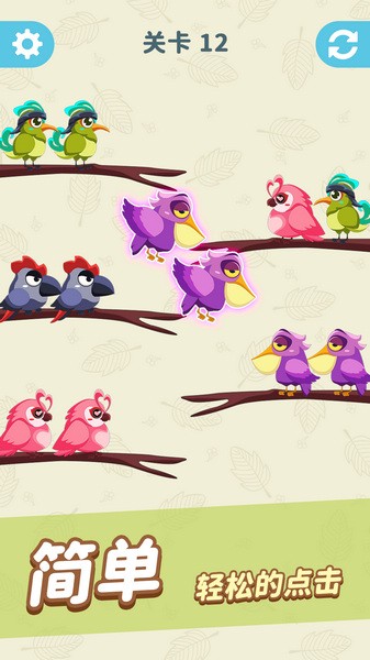 1、打开游戏,然后就点击相同颜色的鸟,让它们飞到同一处树枝上;