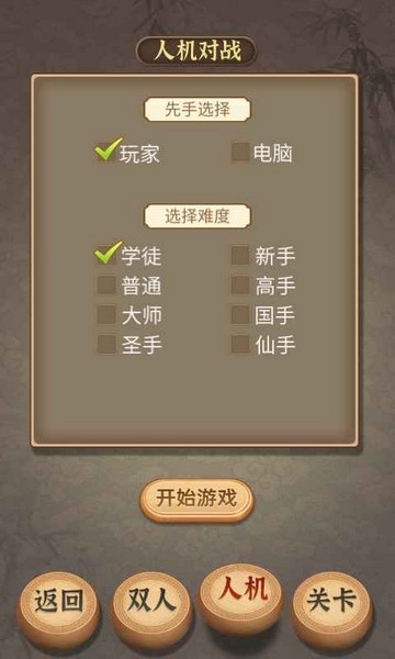 2、这里选择人机模式,在这里可以选择谁先一步开棋、可以选择难度;