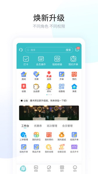 摩术师新版是一款能够同时为商家和技师提供服务的平台,集开单、预约、收款等多项功能于一体,支持验码核销,能够快速为顾客们提供服务。商家们也可以在摩术师新版APP上查看每一笔订单的状态和信息,方便在服务结束后的第一时间内打扫房间。强大的班次管理和会员管理功能则可以大大提高商家们的门店经营效率,手机上就能够轻松管理店铺。