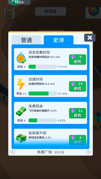 2、点击下方【收集】按钮获取金币,金币足够时升级设施,如将设施升到等级2,能提高金币每秒产出速度。