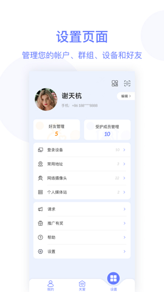 用户也可以对自己家人进行关爱绑定,随时添加设备账号。