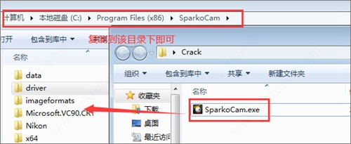 5、打开文件Crack将SparkoCam.exe复制到“C:\Program Files (x86)\SparkoCam”,点击复制和替换;