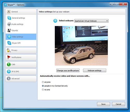 例如,要配置Skype,您需要打开“ 选项”对话框,然后在“ 选择网络摄像头”列表中选择“ SparkoCam虚拟网络摄像头 ”。