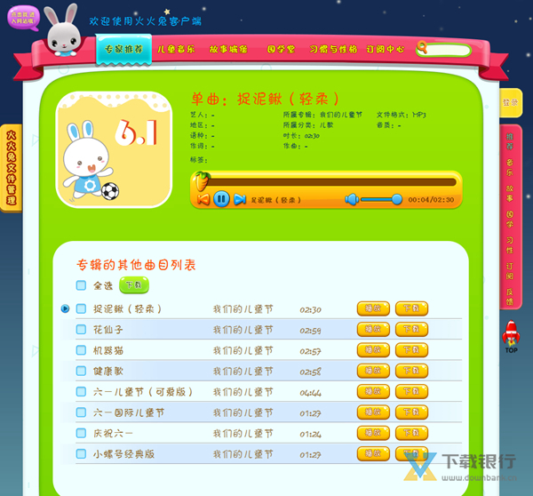 火火兔资源下载中心是一个专为火火兔育儿亲子设备设计的资源下载软件,里面有很多适合孩子的音乐、故事、古诗和名著等内容,还能帮助培养孩子的习惯。操作很简单,只需要把火火兔设备连上电脑,识别后就能直接下载喜欢的内容,还有试听功能方便家长 preview。