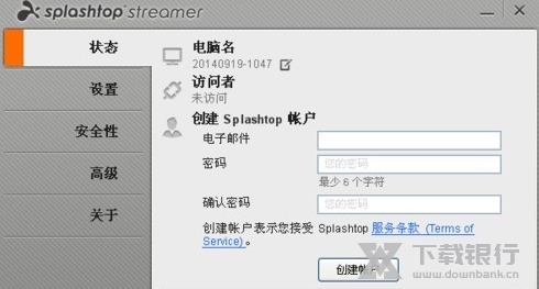 1.首先下载并安装Splashtop Streamer,下载安装后可以看到一个很简单的小对话框画面,这里面我们主要关注两个栏目一个是状态栏,另外一个是安全性。状态栏里面我们可以把自己的splashtop帐户添加,一般是邮箱形式的帐户。而安全栏可以设定我们被远程控制的电脑,在被远程控制时的控制密码,避免被恶意控制。