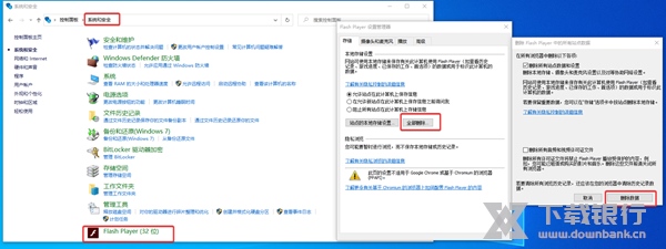 4、清理flash缓存,在“控制面板”中打开“系统和安全”,然后找到“Flash Player”,点击它后在弹出的窗口中点击“全部删除”,最后再在弹出的新窗口中点击“删除数据”就可以了,如下图所示: