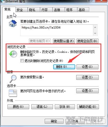 2)接着在打开的internet属性弹框中,在“常规”选项卡中找到浏览历史记录,点击删除按钮。