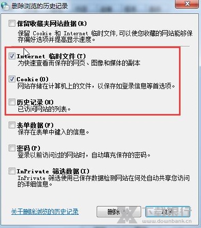3)点击删除按钮后会弹出一个对话框,在这里勾选internet临时文件、cookie、历史记录等三个选项,点击确定即可。