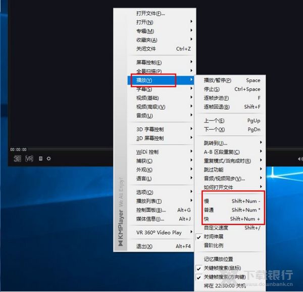 3、设置视频播放的速度,我们可以在kmplayer播放器界面中,点击鼠标右键,在打开的菜单项中我们选择播放,我们能发现排在最下面的,慢-普通 - 块 ,嫌麻烦的话,我们还可以按键盘快捷键“shift+Num+‘-’/‘*’/‘+’”来进行视频播放速度的控制;