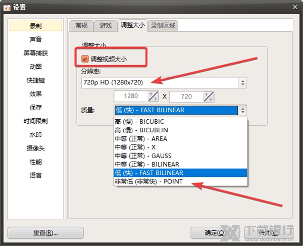 2、弹出设置界面,在录制——调整大小中勾选“调整视频大小”,软件默认分辨率为720P,将其调整为自己认为合适的数值,并在下方的质量中进行选择,最后点击确定即可,如下图所示: