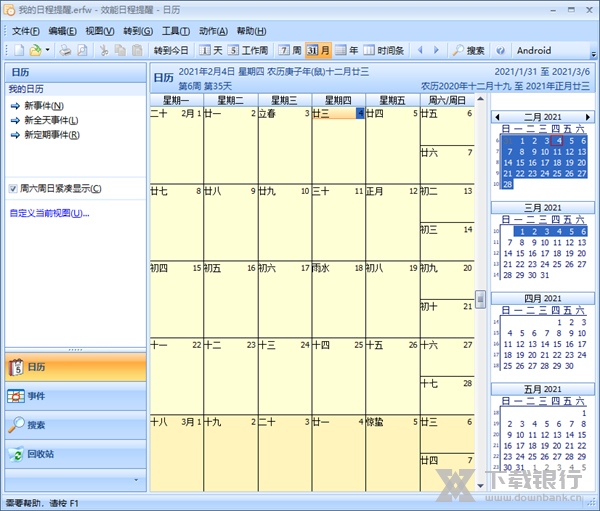 7、软件还支持按分组管理事件、导入预定义节假日、指定不同颜色的事件标签、对事件按优先级管理、回收站等诸多功能。