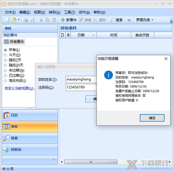 效能日程提醒免费版是一款管理提醒软件,该软件操作简单,内带注册补丁玩家可以完美激活注册授权软件。解锁其中多种功能,而且长期使用不用担心30天时间。通过这款软件轻松帮你管理安排好你的日程,您的任何会议都不会错过。它能够将你所有的事务完美展现在软件上,还支持分组管理事件,使用不同颜色的事件便签,查看事务更加方便,即使面对多场的约会,会议,其他事项也能提前准备轻松应对,软件还能通过简洁明了的日历视图,可以精准安排每月,每年的日程安排,每天将工作上的事情和家庭中的事情都轻松安排起来,任何让你的工作和生活都变得高效率。软件还能将你已过期得事件记录下来,让你能清楚得知道自己哪些事情过期或者没做得,方便自己以后能更加自律。软件还支持中国传统节日的查看和提醒功能,让不知道农历阳历的朋友们能更加一目了然。是一款非常不错计划安排软件。玩家只需输入下列图中的账号秘密即可完成破解,欢迎有需求的玩家前来下载哦!