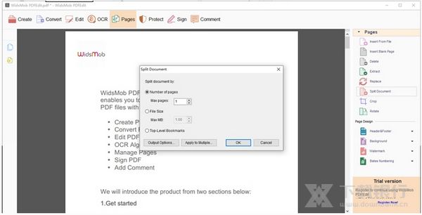 在弹出窗口中设置“拆分”选项,单击“确定”以拆分PDF。