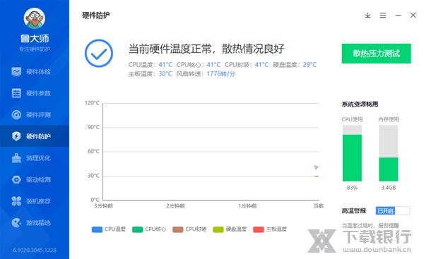 在硬件温度监测内,显示计算机各类硬件温度的变化曲线图表。鲁大师电脑版硬件温度监测包含以下内容(视当前系统的传感器而定):CPU温度、显卡温度(GPU温度)、主硬盘温度、主板温度。