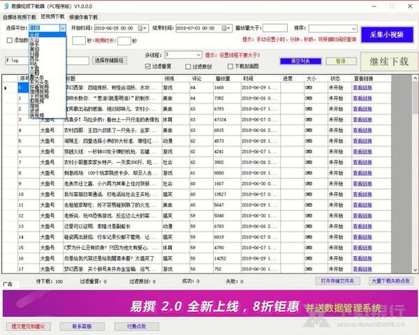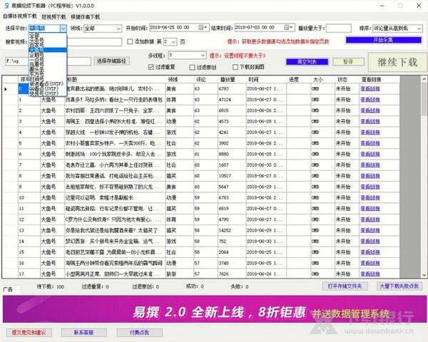 2、根据平台、领域、时间、播放量等筛选条件;点击开始采集出现100条数据,翻页可以或得其他数据;选择储存路径后点击继续下载即可开始下载