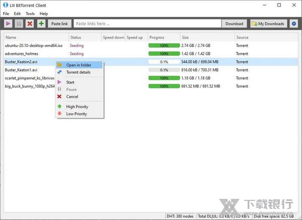 右键单击一个torrent,以访问该程序的上下文菜单。这使您可以在资源管理器中打开种子文件的文件夹,开始或暂停下载/上传。单击“高优先级”可将洪流上移,或使用“低优先级”选项将其拉低。