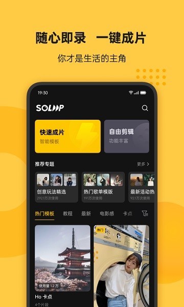 soloop即录是一款AI视频剪辑APP。你想要剪辑出电影般的效果吗?你想要只用手机就完成视频的拳套剪辑流程吗?在soloop即录app,你只需要一键,就可以完成视频创作。从拍摄到后期处理,为您实现一条龙服务,让用户轻松完成自己想要的视频,功能就是这么强大!此外,Soloop即录还提供智能组合剪辑与多种模板,多彩模板可以为您的视频后期剪辑添加各种风格,包括电影级后期配音、灵活省心的字幕添加和搞笑表情等。