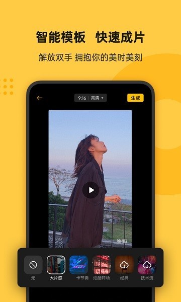 4、不喜欢智能模板的用户可以自己进行调节,调节完毕后点击右上角位置的【生成】选项即可成功导出视频。