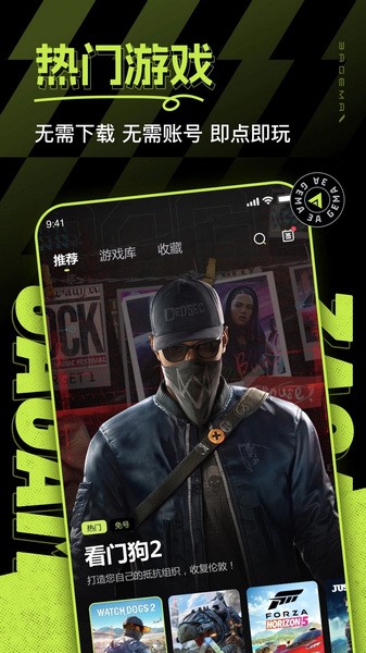 1、打开3A云游,进入应用主界面,包括推荐、游戏库、联机专区和收藏频道,在当前推荐频道可看到系统推荐的不同游戏;