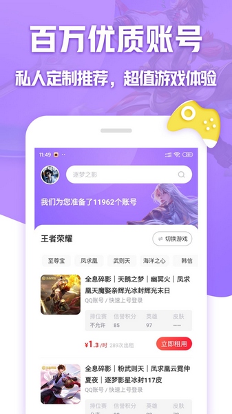 租号玩专业版是一款安卓游戏账号租赁App,该应用中可以快速挂出或购买各大游戏账号,交易模式安全可靠,通过中介收款,验收账号后方可收款,并且还能对各种装备、皮肤道具内容进行交易,让你玩游戏过程更加轻松简单,让土豪轻松上分。