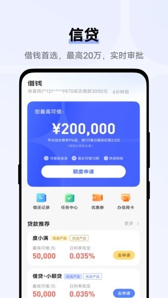 最高20万无抵押贷款额度,最长可分12期;正规金融机构放款,利息低;纯线上快速贷款,最快1分钟到账。
