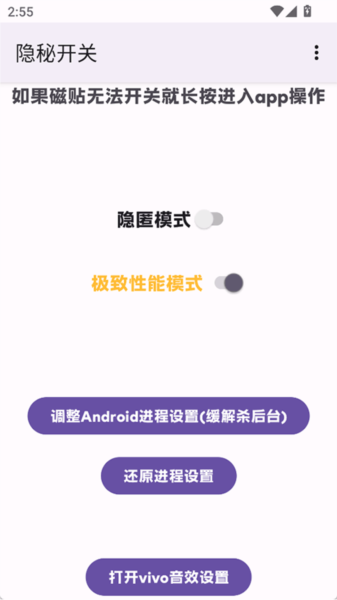 隐秘开关手机版是一款专为VIVO手机打造的工具,主要用来优化手机性能和隐藏隐私信息。它能调整CPU参数,提升游戏帧率和多任务运行效率,还能通过“隐匿模式”关闭传感器防止偷窥。软件里有很多实用功能,比如把社交或金融应用图标换成计算器或日历图标,避免被别人发现;还可以屏蔽通知栏的信息,防止隐私泄露。