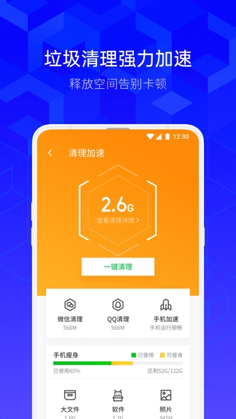 2、手机加速:一键释放系统内存,彻底清理系统垃圾,加速手机运行速度;
