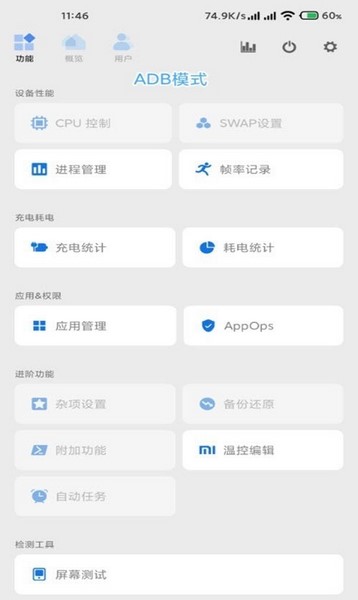 在功能模块中,用户可以进行帧率记录,充电统计,耗电统计,应用管理,活动/服务,温控编辑以及屏幕测试;