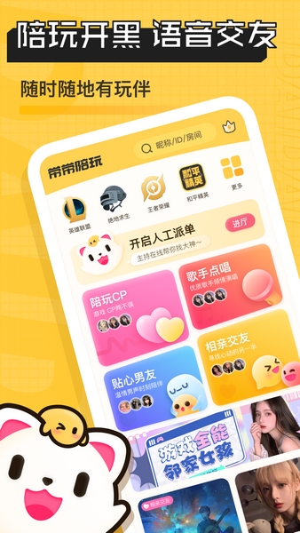 热门游戏全支持(英雄联盟LOL、王者荣耀、和平精英、永劫无间、绝地求生PUBG、刀塔、守望先锋、Apex英雄、第五人格、穿越火线、DNF、云顶之弈等),技术流、声音控等各类大神应有尽有,提供游戏陪玩、陪练、代练等服务,吃鸡上分上段都满足;一键匹配组队开黑,超皮队友陪你排位,带你上分,约宝宝们玩游戏,超多小姐姐给你比心哦~