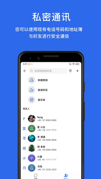 您可以使用现有电话号码与地址簿与好友进行安全通信