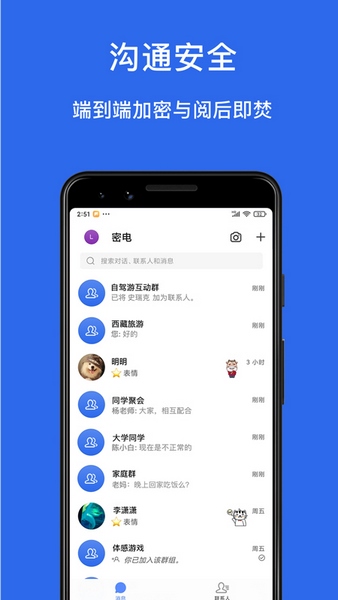 密电(英文名:Cipchat)是一款专注端到端加密的社交软件,用户可以在此交到来自世界各地的朋友,和他们以各种形式聊天或者进行语音、视频通话,达到沟通交流的目的;且融合了各种常见的功能,不用担心隐私信息的泄露,是安全社交的实用工具。