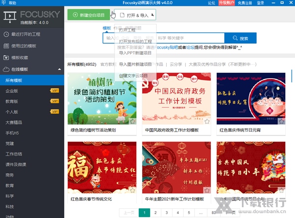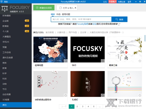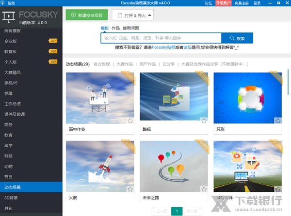 Focusky是一款3D多媒体演示软件,软件拥有特色的软件界面,使用方法简单,操作起来容易上手。软件内有海量的建设模板,人物模板,动画模板都能免费使用,帮助用户节省大量制作时间,提高办公效率。另外支持多种输出格式,如HTML网页版、视频等进行加密保护,更加安全可靠。以幻灯片形式展出,让文稿更加生动有趣。