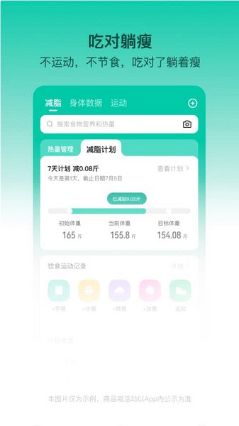 营养师提供专业减肥减脂指导,无论是美容整形瘦腿,都能实现饮食健康瘦身、科学减脂结合智能硬件,体重体脂秤、食物秤,测量记录体重体脂率等身体数据、计算统计食物热量,智能化管理身体健康饮食百万食物库,针对减肥、减脂、增肌、瘦身塑形等不同需求,定制不同的营养菜谱,短视频教学,助你做出好看、好吃、又能瘦身减肥的减肥餐 为您推荐饱腹感强、卡路里低的健康减肥餐食物、菜谱,减少热量摄入,通过菜谱短视频,可一键记录早餐、午餐、晚餐和加餐及食物、菜谱热量卡路里摄入分析食物热量、营养元素成分,卡路里、脂肪、蛋白质、维生素、钙、锌、铁等一目了然。