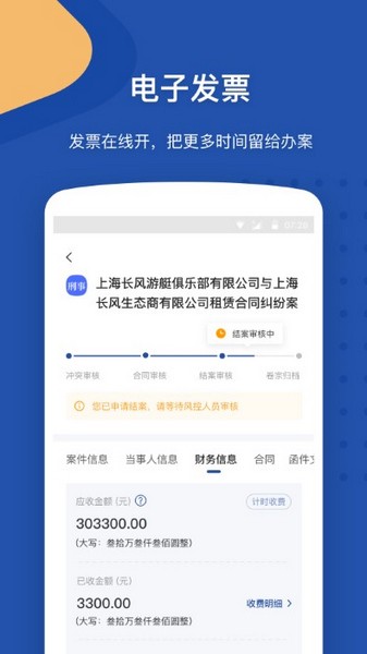 4、涵盖了许多的案件内容栏,拥有案件信息、当事人信息、财务信息以及合同等栏目;