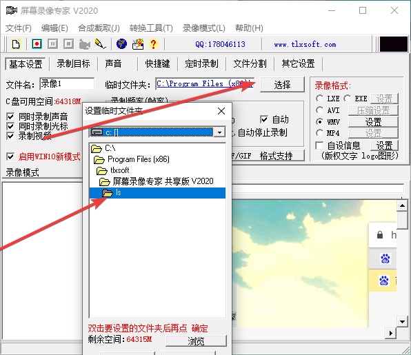 2、在“基本设置”界面中,选择临时文件夹,以后录制生成的视频都会放在这个文件夹中。