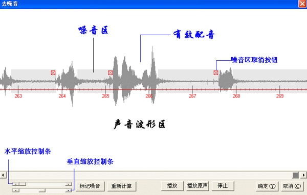 在此窗体打开时软件会根据系统默认参数对声音进行分析计算,计算出噪音区,并且在声音波形图中画出噪音区。