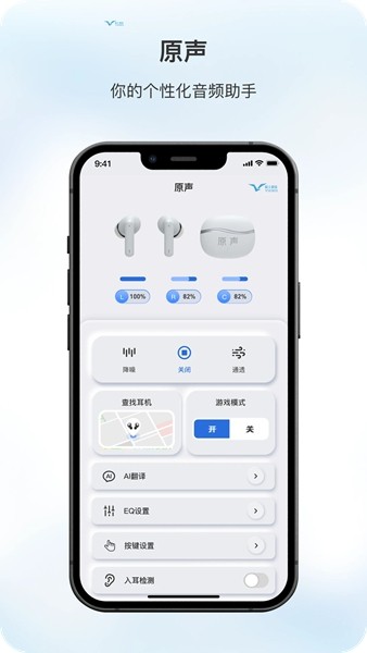 原声是一款帮助用户更好使用TWS蓝牙耳机的手机APP。其核心功能包括电量显示、降噪通透、EQ调节、按键设置以及远程空中升级(OTA)。