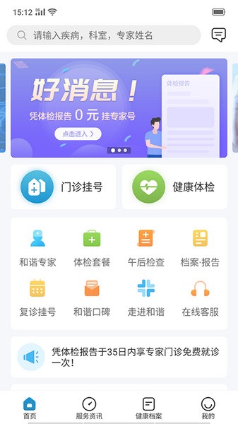 和谐医疗app涵盖体检预约、报告查询、报告解读、挂号问诊、健康管理等医疗健康服务,在线提供体检套餐、自选定制、团队体检;开设特需门诊和专家门诊,设立15个科室,签约省级三甲医院专家团队,提供分时段、私密空间一对一、无假日及夜间坐诊等门诊服务。