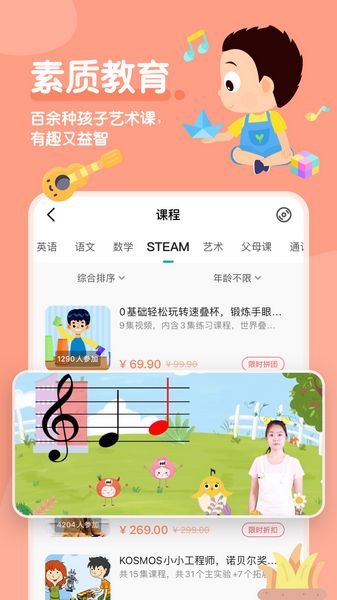 艺术课程一100余种孩子艺术兴趣课程,包含舞蹈、声乐、象棋、国画等多个领域技能.