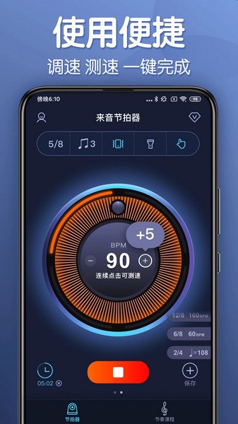 这款专为音乐爱好者打造的应用,不仅帮助用户细分音符进行学习,还使理解乐谱变得轻松,提供两种节奏模式,支持架子鼓等各类乐器演奏,最大程度保障用户节奏练习的稳定性和合理性,提供更佳的学习体验。来音节拍器能满足不同节拍需求,用户可自定义节拍类型并且调节音色,享受多种音效。此外,应用还有全屏纯净模式让你尽情沉浸在音乐世界中,享受舒适操作体验的同时帮助你达到更高水平。