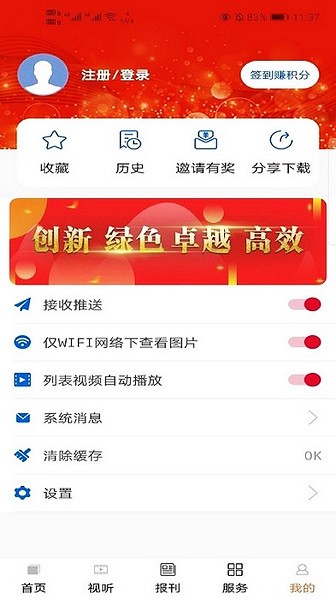 5、打开个人中心,查看自己收藏的各种内容,了解自己的历史浏览记录,一键开启推送功能。