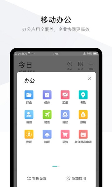 移动审批,请假、报销、出差、采购申请、物品领用……审批工作随时随地处理,实现无纸化的移动办公。马上审批、让工作更高效轻松;