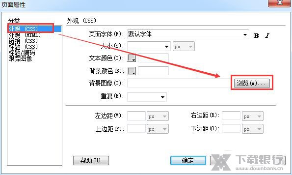 打开页面属性后,选择外观分类,然后点击背景图像后面的浏览,选择背景图片,如下图所示。