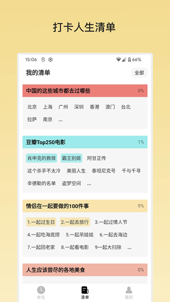 软件的功能很丰富,包括尝遍各地美食、一生必去的景点、情侣间的100件小事等等。这些清单不仅能提醒自己完成目标,还能和家人朋友分享生活点滴,增进感情。特别是自动倒计时功能,可以避免错过重要的日子,比如生日或者纪念日。