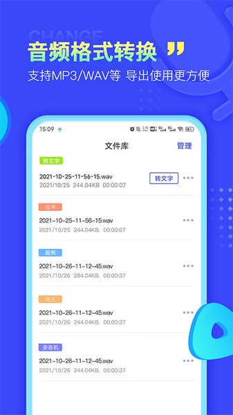 - 将保存的文件记录在文件库中,提供保存录音音频,识别文本,可将文档分享至微信、QQ等
