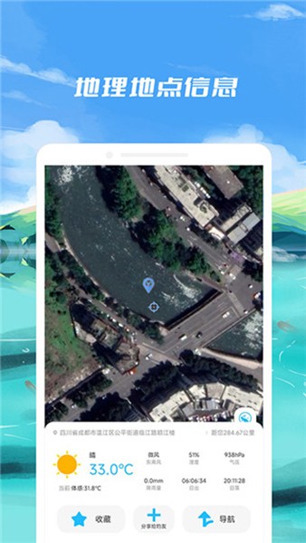 5、实时显示所在位置的温度、天气、风力、能见度等信息。