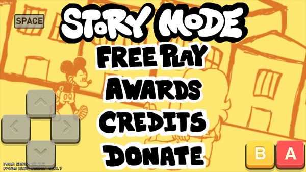 1、打开Sunday Night Suicide游戏,会看到一只灰色的米老鼠,点击屏幕进入到主界面。左边是上下左右方向键,右边是返回和确认键。通过点击上下键来选择中间的功能选项。