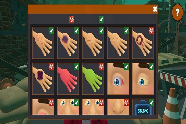 边境丧尸检察官是一款模拟边境检查的游戏,但本游戏不是检查非法走私、逃犯或是别的是货物,而是感染了会使人变成丧尸的致命病毒的感染者。你需要对每一个在隔离墙外试图进入的幸存者进行详细认真的检查,用扫描设备发现任何可疑的伤痕、瘀伤和皮疹,检查他们的呼吸,进行认真比对,将确认感染的人进行清楚,疑似感染的进行隔离,庇护锁的安危就在你的手中掌握,仔细检查,不要放进一个感染者。